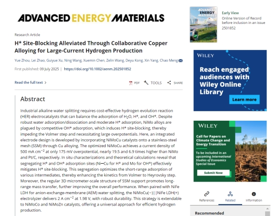 点击:2025年7月,91社区 91社区 绿色氢能技术团队周玥副教授在能源材料科学领域国际顶级期刊《Advanced Energy Materials》发表了题为“H* Site-Blocking Alleviated Through Collaborative Copper Alloying for Large-Current Hydrogen Production”的研究论文。
