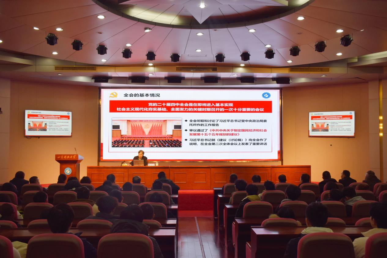 薛庆忠围绕党的二十届四中全会整体情况、准确把握“十五五”时期在基本实现社会主义现代化进程中的重要地位、深刻领会“十五五”时期经济社会发展的指导方针和主要目标、全面理解“十五五”时期经济社会发展战略任务和重大举措、坚持和加强党的全面领导五大方面,作了系统而深入的阐释。他结合学校学科建设、人才培养、科研创新等发展实际,就中央全会精神在学校的贯彻落实作出具体部署,明确了各学院结合专业特色推进全会精神落地的实践路径。